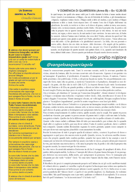 La vita vera e la creatività autentica fioriscono in chi ha il coraggio di spogliarsi di tutto, di ripartire dalla propria nudità. La forza e l’energia del chicco di grano hanno bisogno di un passaggio doloroso ma necessario, della morte, per sprigionarsi in pienezza. Non c’è immagine più eloquente per chi vuole “vedere” Gesù: “Io sono tutto l'amore che ho dato, tutto l'amore incondizionato”.